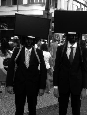 世界杯期间,一些商家在街头做宣传,在沙滩边设置有一家电视机公司,让两个人头顶着播放世界杯比赛的电视屏幕,来为电视机品牌做推广。