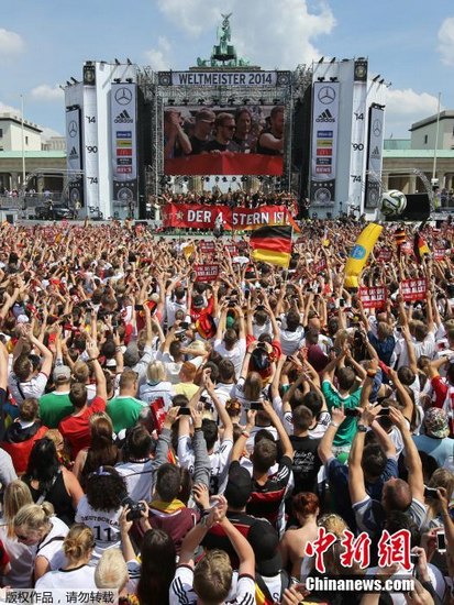 中新网7月15日电 北京时间7月15日,德国国家队带着大力神杯回到德国。在首都柏林地标性建筑——勃兰登堡门,成千上万球迷与他们的英雄欢庆胜利,共享荣耀。