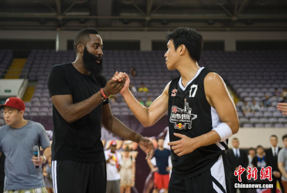 哈登在京教红牛传奇小球员 笑称胡子赋予超能力