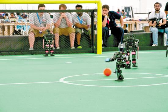 机器人世界杯比赛现场,一个机器人正起脚射门
