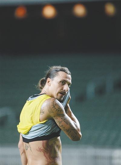 昨日,巴黎圣日耳曼球员伊布在香港大球场训练,他撩衣擦汗时,露出了背上的大红龙。巴黎圣日耳曼今日将与中国香港杰志队进行一场友谊赛。