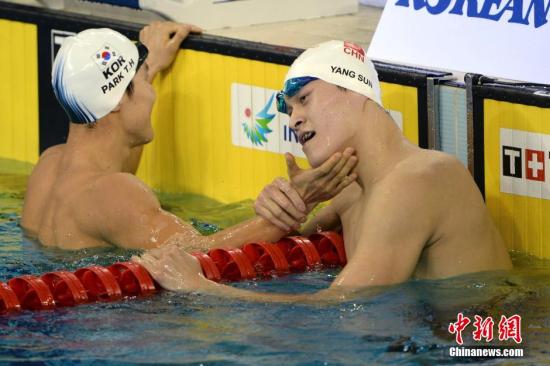 9月23日,在2014仁川亚运会男子400米自由泳决赛中,中国选手孙杨以3分43秒23夺冠,韩国选手朴泰桓获得季军。比赛结束后,朴泰桓摸孙杨下巴。中新社记者 廖攀 摄