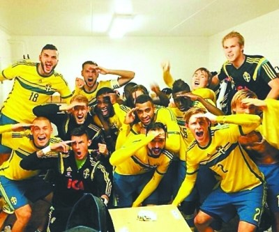 赛后,瑞典队队员在更衣室内摆出“再见”的手势,嘲讽得瑟的法国人。