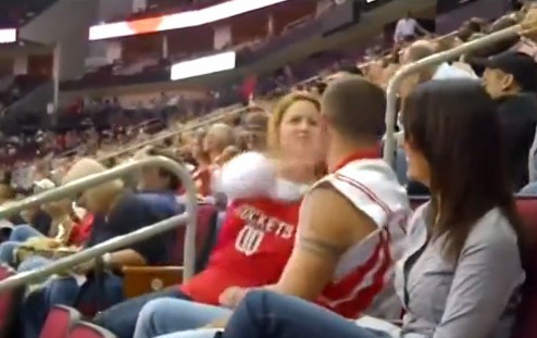 2013年3月的一场NBA常规赛中,火箭111-81战胜太阳,休城球迷都为大胜而欢呼,但一名球迷的经历却颇为坎坷。看台上,一名男球迷一时兴起,吻了一下旁边的女神,不成想收获的却是耳光伺候。虽然尴尬,但这名球迷还是以火箭熊玩偶和爆米花道歉,但女神不买账,更是把饮料倒在了他头上。这时,旁边的美女看不下去了,起身主动亲吻男球迷,二人在激吻之后也手拉手离开看台。