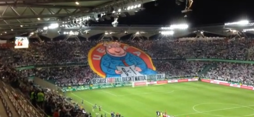 在北京时间2014年9月4日凌晨的欧联杯资格赛中,华沙莱吉亚队球迷挂出印有猪头图案横幅讽刺欧足联。据悉,在横幅里,欧足联的徽章标志被一巨大猪头代替,并标有“6<1”数字,而横幅则被球迷们点燃的烟火包围。巨大横幅下面还打出标语“欧足联眼里只有钱,没有足球!”显然,华沙球迷是在为自家球队在欧冠资格赛中被淘汰出局抱不平。在此前的欧冠资格赛中,华沙莱吉亚两回合4-1、2-0大胜凯尔特人,但因其第二回合使用被禁赛球员被判0-3告负,最终被淘汰出局。
