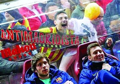 2014年1月,西甲联赛第19轮,巴萨客场挑战马竞。双方踢得拳脚相加,寸土不让,拼到刺刀见红的程度。但是马竞最恨的球队并非巴萨,而是同城死敌皇马。于是在皇马死敌的地盘上,巴萨球迷有了发挥的余地,即在给巴萨加油外顺带羞辱皇马。在上半场梅西还在替补席时,一张他背后球迷的画面就颇为抢镜。某位巴萨球迷居然制作了一个穿着“C罗”球衣的充气娃娃,并把它举到梅西的座位后面,颇有点抢镜的意思。