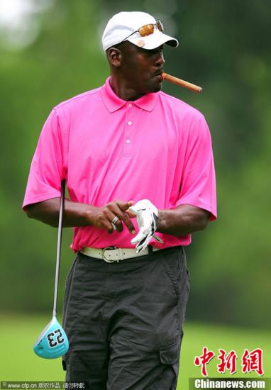 资料图:2012年7月12日,由众多体育明星参加的2012高尔夫名人赛举行。“篮球飞人”乔丹叼雪茄参赛引人注目。图片来源:CFP视觉中国