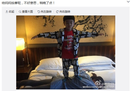 杨威在微博中写到:“给妈妈按摩呢,不好意思,稍(发)晚了点!”网友看后纷纷赞杨阳洋是“会关心妈妈的小暖男”。