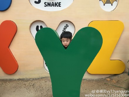 中新网5月8日电 今日,杨威妻子杨云在微博中晒出爱子杨阳洋的萌照,并称:“我给他拍,他给我拍,忘带神棍了”。照片中杨阳洋齐刘海亮相,躲在字母雕塑后面,只露出一张萌脸。