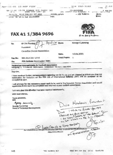 2001年国际足联技术发展部致信加拿大足协,主要内容为通告任命刘虎为2001年国际级裁判员的相关工作事宜。图片来源:中国足协官网