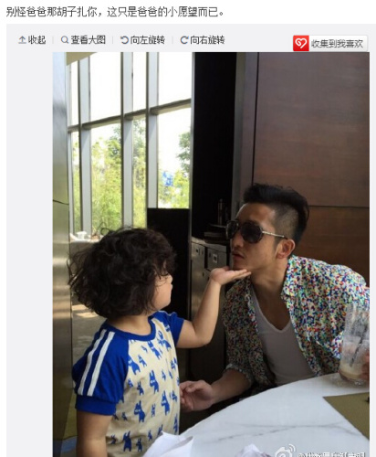 中新网5月26日电 昨天下午,邹市明在微博中晒出了与儿子嬉戏的照片,玩性大发的邹市明还用胡子扎儿子的小脸。网友看后大赞邹市明儿子长得萌,父子嬉戏场面温馨,而邹市明的穿衣风格却遭到网友“吐槽”:“碎花衣服不适合你,太浮夸了大哥”。
