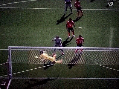 这次精彩的解围是由于对方的来球打在了大宫松鼠的球员身上产生变线,朝球门飞去,而此时已经失去重心的加藤顺大顺势翘起小腿,力保球门不失。