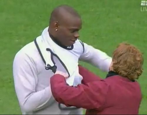 不过最令人感到不可思议的还是他在训练场上的“穿衣门”。当时球队在进行赛前热身,巴洛特利与一件背心较上了劲。无论他想尽任何方法,就是穿不进去,意大利人愤怒地将背心扔在一旁,结果好心的助教上前帮他穿好了背心。但几分钟后悲剧再次发生,巴洛特利在换另一件背心时又穿不上了,他竟然将脑袋套进了袖口。几天后的训练课上,当哲科为巴洛特利示范如何穿背心后,感激涕零的意大利人还特意上前拥抱致谢。