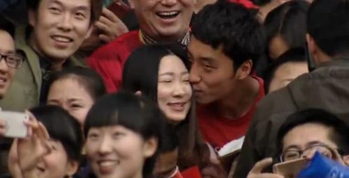 今年2月14日是超级杯比赛日, 更是情人节。在恒大对阵鲁能的中场休息间隙,电视镜头突然转向了黄龙体育场的看台,很多球迷举着手机围在一起对一对情侣球迷进行拍照。原来是一名男球迷手持玫瑰花向女朋友求婚,身穿红色T恤男球迷还未等女球迷反应过来,即突然强行拥住女朋友进行了长达5秒钟的激吻,现场观众一片欢笑,随后,两人接受了旁边球迷的拍照,并对着场边的电视镜头挥手致意,现场观众用长时间的鼓掌为两位新人送上了自己的祝福。