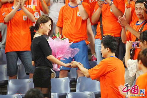 2013年6月30日,在中超联赛第15轮鲁能主场对阵人和的比赛中,一位男士球迷在北看台内趁中场休息时突然向身边的女友献上一束鲜花进行求婚,女孩在惊讶和感动之后,欣然接受男友的求婚。