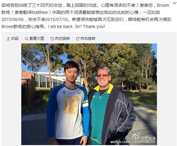 宁泽涛在微博写道:“即将告别训练了三十四天的泳池,踏上回国的归途。心里有很多的不舍!谢谢您,Brown教练!谢谢翻译Matthew!中国的两个词语最能够表达我此时此刻的心情:一见如故2015/06/06,依依不舍2015/07/10。希望很快能够再次见到您们,期待能有机会再次得到Brown教练的悉心指导。I will be back, Sir! Thank you!”