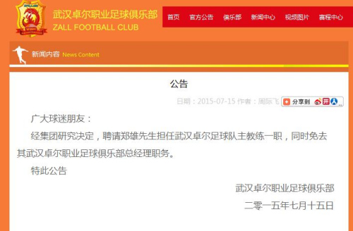 中新网7月15日电 今天下午,中甲武汉卓尔俱乐部在其官方网站上宣布,郑斌辞去球队主帅一职,同时也宣布免去郑雄俱乐部总经理一职,聘其为球队新主帅。