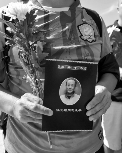 虽然昨天是个工作日,但仍有数百名球迷早早地来到北京八宝山殡仪馆门外。当记者九点多到达八宝山殡仪馆时,已经有很多球迷到达现场,他们有序地站在殡仪馆大门前的广场两侧,举着“洪老一路走好”和“国安绿茵建功勋,北京球迷永怀您”的条幅及标语。前来参加告别仪式的人很多,国安俱乐部工作人员组织大家在门外排起长队,依次有序地入场和洪指导最后说一声再见。