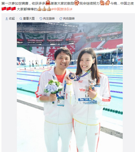 中新网8月7日电 北京时间昨晚,在2015年世界游泳锦标赛女子50米仰泳决赛中,中国选手刘湘以27秒58获得第三。赛后,刘湘在微博中写道:“第一次参加世锦赛,收获多多,谢谢大家的鼓励。我会继续努力,今晚…中国之夜,大家都棒棒的#中国游泳队#”。同时附上一组个人照片以及与队友的合照。