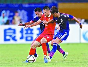 于大宝遭日本队两人夹击。 广州日报记者 廖艺 摄