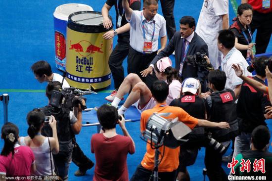 8月11日,羽球世锦赛男单决赛林丹2-1击败李宗伟,获得个人第五个世锦赛男单冠军,李宗伟最后时刻伤退。图为李宗伟抽筋场边急救。图片来源:CFP视觉中国