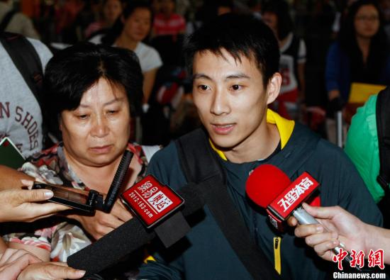 2012年7月30日,中国男子体操选手滕海滨回到北京,他的母亲(左)在接机时上前抱住他,并忍不住流下了眼泪。中新社发 张浩 摄