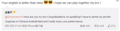 秦升在微博中是这样写的:“@Giomoreno10 How are you my bro! Congratulations on qualifying! I have to admit you are the magician in Chinese football field and I really enjoy your performance。(你好,莫雷诺,祝贺申花晋级,我不得不承认,你是中国足球赛场上的魔术师,我很享受你的精彩表现。)”