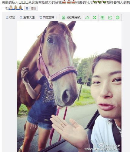 中新网8月31日电 北京时间今天凌晨,留洋德国的女足门将王飞在微博中晒出了一组游玩照。照片中,王飞时而与马亲昵互动,时而大快朵颐。网友看后羡慕地表示:“日子过得好潇洒”,还有网友称赞王飞的身材与气质:“真是白衬衣穿出超模风采呀”。