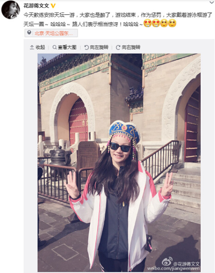 中新网10月23日电 国家花游名将蒋文文在微博中晒出多张美照,照片中她一席运动装束,戴着墨镜,头戴少数名族帽子,混搭风格不失美丽,引来众网友点赞。