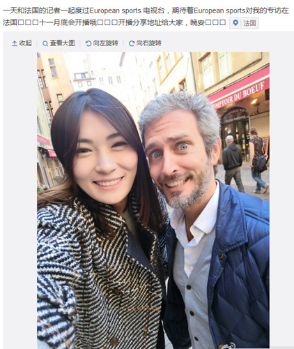 王飞在微博中写道,“一天和法国的记者一起度过European sports 电视台,期待着European sports对我的专访在法国,十一月底会开播哦。开播分享地址给大家,晚安。”