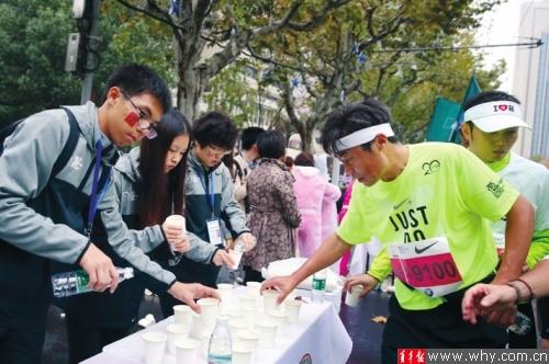 “上马”志愿者们为运动员提供饮用水。青年报记者 施培琦 摄