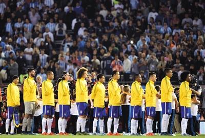 世界杯南美区预选赛前阿根廷与巴西球员为巴黎恐袭遇难者默哀。