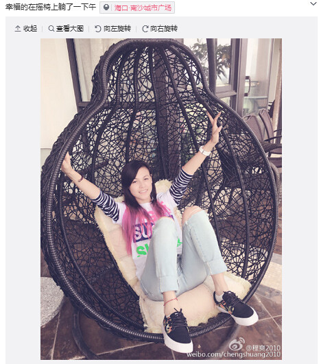 程爽在微博中写道:“幸福的在摇椅上躺了一下午。”网友纷纷点赞,羡慕她“舒服极了”。