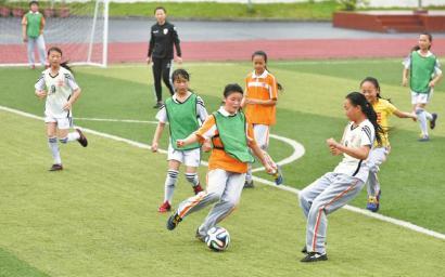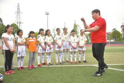 14日,广安市,皇贝足球俱乐部教练张林海为广安希贤小学女子足球队上课。