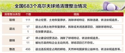 683个球场全部按照取缔、退出、撤销、整改四类进行了清理整治,其中,111个球场已取缔到位,18个球场被责令退出,47个球场已落实了撤销要求,11个球场已被地方政府和企业主动关闭,其余496个球场已进行整改。目前清理整治的高尔夫球场名单可以到相关网站上进行查询和核实。