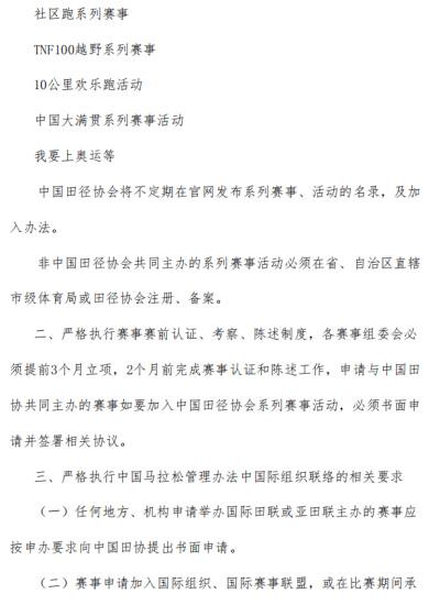 通知提及将严格执行中国田径协会赛事立项认证制度,未经中国田径协会认可的系列赛事将不予认证。中国田径协会将不定期在官网发布系列赛事、活动名录及加入办法。