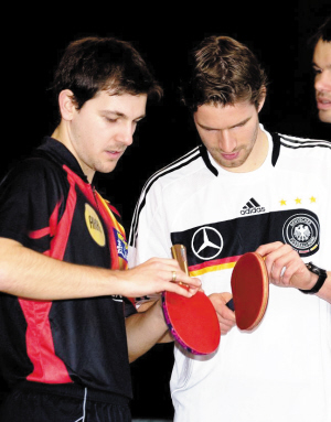波尔和弗雷德里希在研究球拍胶皮。