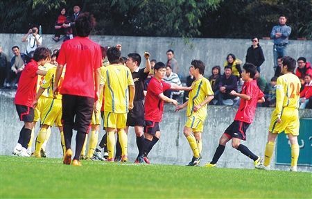 第一次冲突最终在十余人的劝阻下暂时停息,而这仅仅只是开始,比赛从这以后似乎直接变成了“武斗”,身体的冲击和飞铲明显增多……球迷们似乎很享受这样的局面,两边的球迷阵营开始了场外的较量,整个毛家湾充斥着“雄起”的吼声。