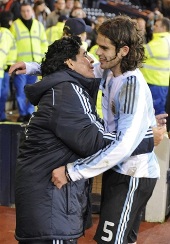 图为马拉多纳与阿根廷球员加戈拥抱,相庆胜利。