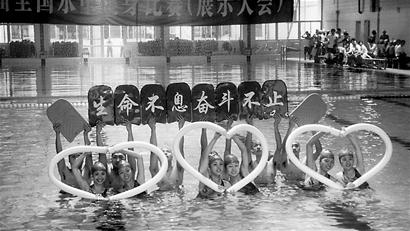 第二届全国水中健身比赛昨(26)日在成都体院游泳馆举行,来自中国澳门和南京等地专业俱乐部的水上高手云集蓉城。不过,全场的焦点都集中在来自汶川的阿坝师专身上,受到“5·12”地震影响的他们用3段震撼人心的精彩表演获得现场最大的掌声。最终,阿坝师专以自创的音乐、歌曲和精彩的编排动作造型囊括徒手、器械和自选3项冠军并获得赛会精神文明金奖。