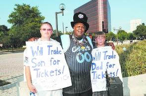 NBA 总决赛第三轮昨天在奥兰多展开较量,现场球迷誓要把魔术主场营造成湖人队的“闷罐式地狱”。安利球馆自然一票难求,一个小时就售完了所有门票,一些手慢的痴心球迷则想出了“求票”的怪招:两位父子球迷分别打出了“Will trade son for tickets!”(为门票卖爱子)和“Will trade Dad for tickets!”(为门票卖老父)的标语。如此“痴情”令人动容。