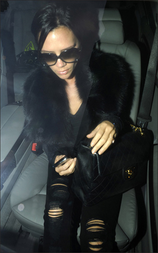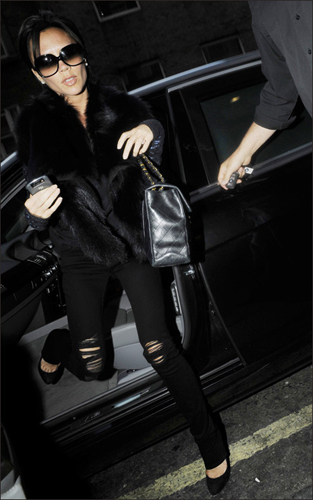 一向是站在潮流间断,绝对走超级贵妇路线的贝嫂维多利亚·贝克汉姆最近也挡不住破洞裤这股十分抢劲的时尚风的侵袭,也穿起了破洞裤子,但是虽然下身走了街头随性的路线,上身却硬要坚持自己的奢华装扮,黑色的皮草立撑场面。