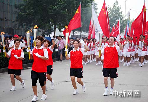 中新网石家庄8月18日电 (记者 牛琳) 18日上午,河北省会石家庄市世纪公园中心广场歌舞欢腾,人们用喧天地锣鼓迎接第十一届全运会火炬的到来。