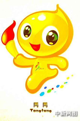 其中,吉祥物“同同”是将一滴铜水运用卡通的形式作拟人化设计,头部以道教“太极八卦图”为背景元素,色彩明快而华丽,反映了深厚的道教文化。“同同”手执火炬向前奔跑,动感十足,惹人喜爱,脚下的彩色圆点为奥运五环色。