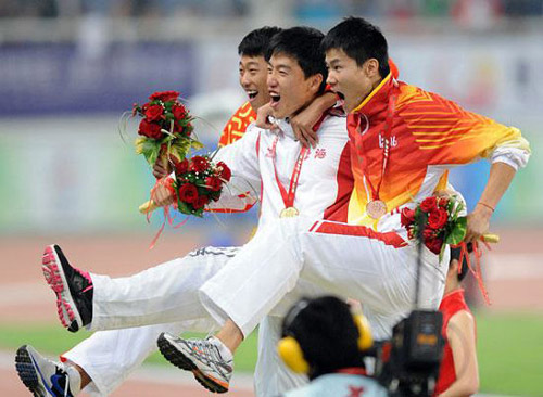 10月25日,第十一届全运会田径男子110米栏决赛中,上海队选手刘翔以13秒34的成绩夺得冠军,解放军队选手纪伟和河北队选手史冬鹏分获二、三名。在领奖台上,三人大摆跨栏的pose。