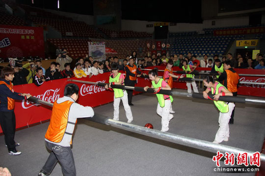 据悉,体育庙会、开心版的主打活动是真人桌上足球。即把年轻人喜欢的桌上足球放大,做成真人版。比赛规则充满趣味,参赛者双手被固定在游戏杆上,活动范围极度缩水,但传球、进攻、射门,同样能秀出参赛者的精湛脚法。