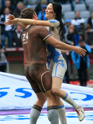 德乙联赛第22轮,慕尼黑1860在主场以5:1大胜圣保利。 终场前从主客两队的看台上分别跃下一个身穿1860队服的姑娘和一个身穿圣保利队服的小伙,两人一路狂奔来到球场中圈,旁若无人的热吻起来。仔细观察才能发现他们所穿的“队服”的奥秘----这对情侣都只穿了一条内裤,他们身上的衣衫完全是足以乱真的人体彩绘。现场保安也为这浪漫一幕所感动,他们面带微笑将这对情侣请出草坪。(图片来源:1860队官方网站)