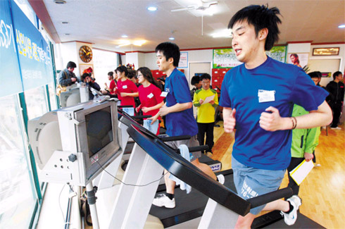 面试场面乍一看还以为是跑步机比赛。韩国被褥公司Evezary13日在首尔徽庆洞一家健身中心对新职员进行了第三轮面试。面试者跑30分钟的跑步机,然后面试官依据面试者的体力评分进行选拔。