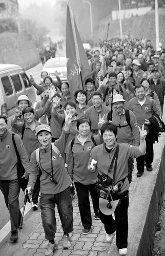 “踏遍青山人未老”第一站活动就吸引了1300多人参加,其中“红衫军”的阵容最为壮观,他们是杭州市登协的会员,集体来参加活动。不过,年轻人也不少,来自浙江工商大学生物专业的60人方阵最为抢眼,他们每个人手上都扎着一根象征“健康”的绿丝带。当然,还有很多“独行侠”,29岁的谢恩震就是其中的一个。