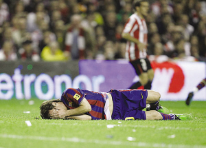 不过最让巴萨不爽的还不是无奈将榜首席位让给死敌皇马,而是该队头牌梅西在比赛中两度受伤。先是在第20分钟,梅西在争抢时,被对方身高1米92的中卫埃莫雷维埃抬脚亮出的鞋钉狠狠踩中右脸部,显然埃莫雷维埃抬脚过高就是故意冲着梅西去的。梅西当即痛苦地捂脸倒地,队医立即进场紧急处理,好一会梅西才起身,但靠近右眼的部分已经被鞋钉划出了一道很深的血口。但梅西还是坚持比赛,因此尽管梅西此战没能进球帮助巴萨取胜,但赛后梅西带伤作战的精神却赢得了媒体的一致赞扬。但在第76分钟,梅西因肌肉拉伤还是提前被博扬换下。据悉,梅西赛后检查的结果是伤势很重,极可能将缺席本周在欧冠、西甲中与国米、皇马的两场关键战役。
